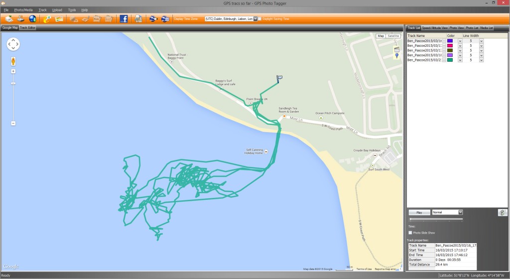 The Trace device logs your position 5 times per second (I don’t know what the Rip Curl device does because they don’t let you get your GPX data out of it) so I wanted to get it as close to this as possible, if you use the fairly user friendly GPS Photo Tracker software that is supplied with the 860E you can configure the device to record the position every second.